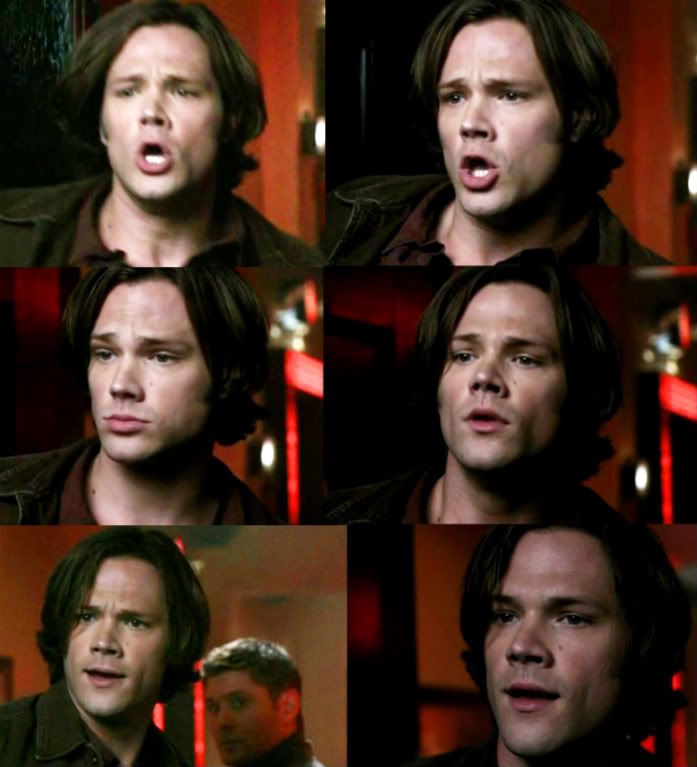 Throughout the first part of the episode, everything's normal. Sam's looking hot as usual, and then he and Dean burst into the hotel room and this little gem follows. Watch how shock becomes voyeuristic interest becomes puritan disgust!